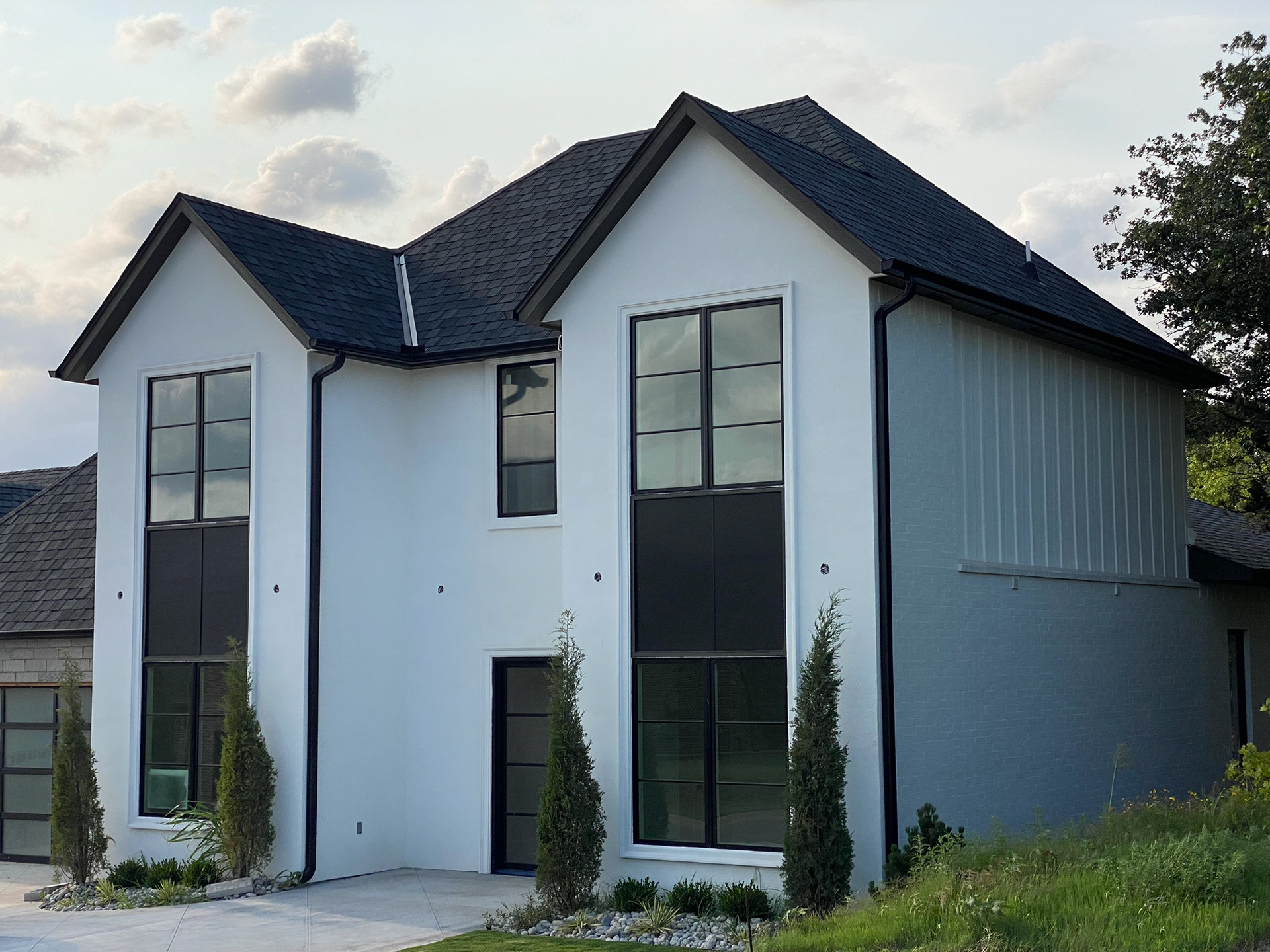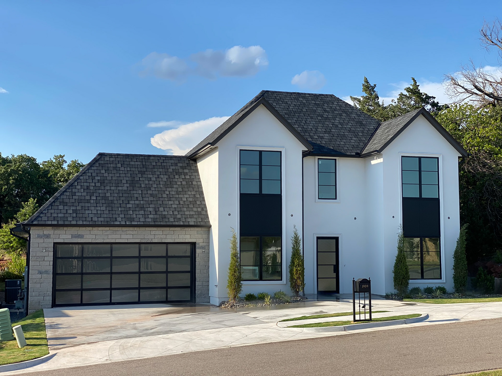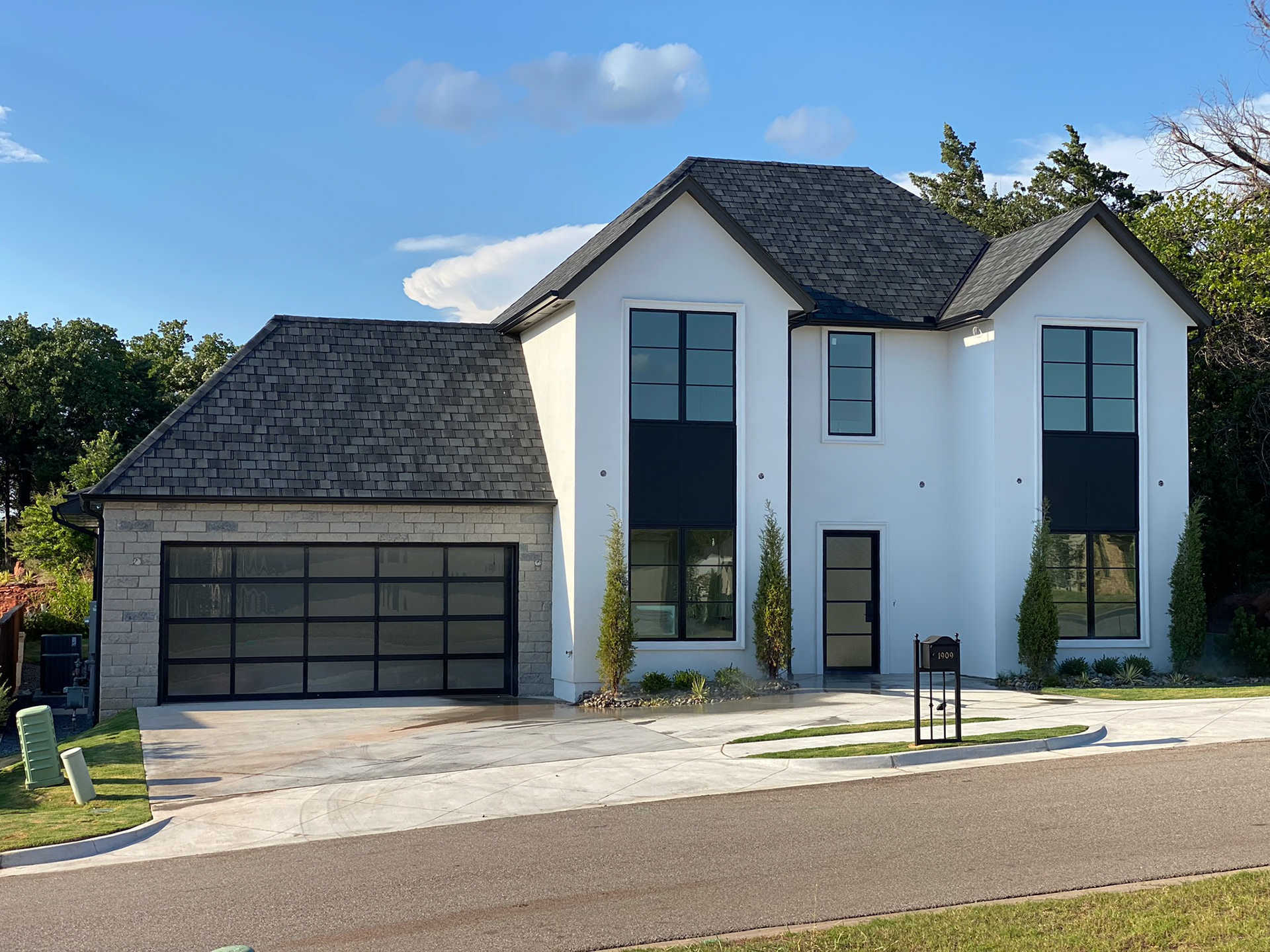 Garage Doors: Contemporary design with glass panels, adding a modern touch to the façade.